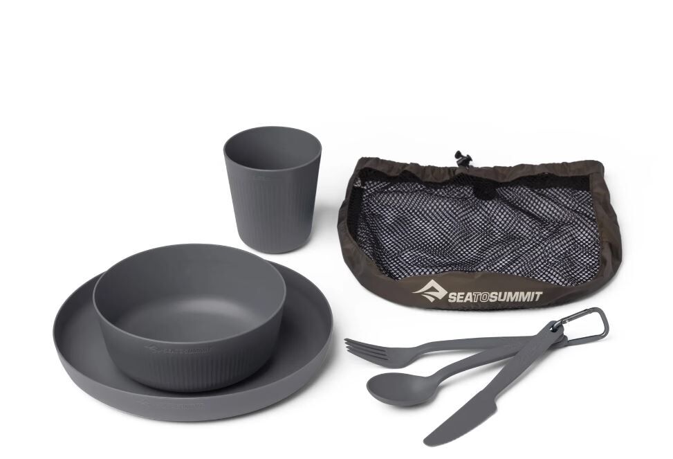 • Everything you need in one kit - includes a bowl, plate, cup, cutlery set with carabiner clip, and mesh sack for compact, organised camp meals